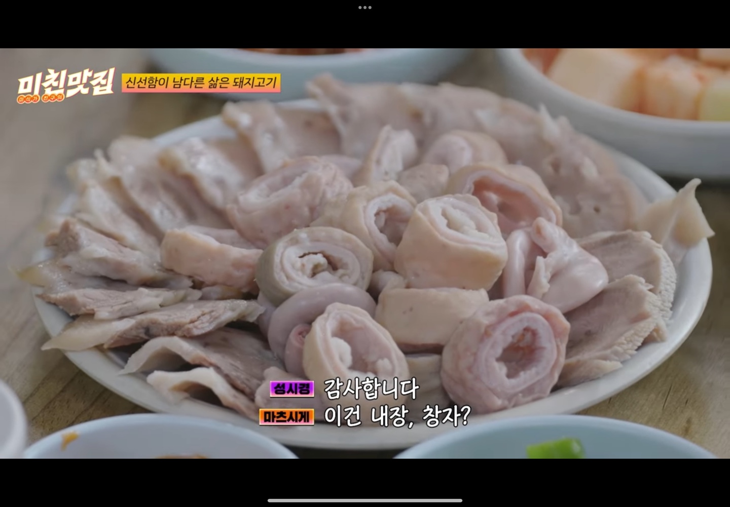코, 막창, 암뽕( 돼지의 자궁)이 담긴 한 접시 가득 삶은 고기가 나옵니다.