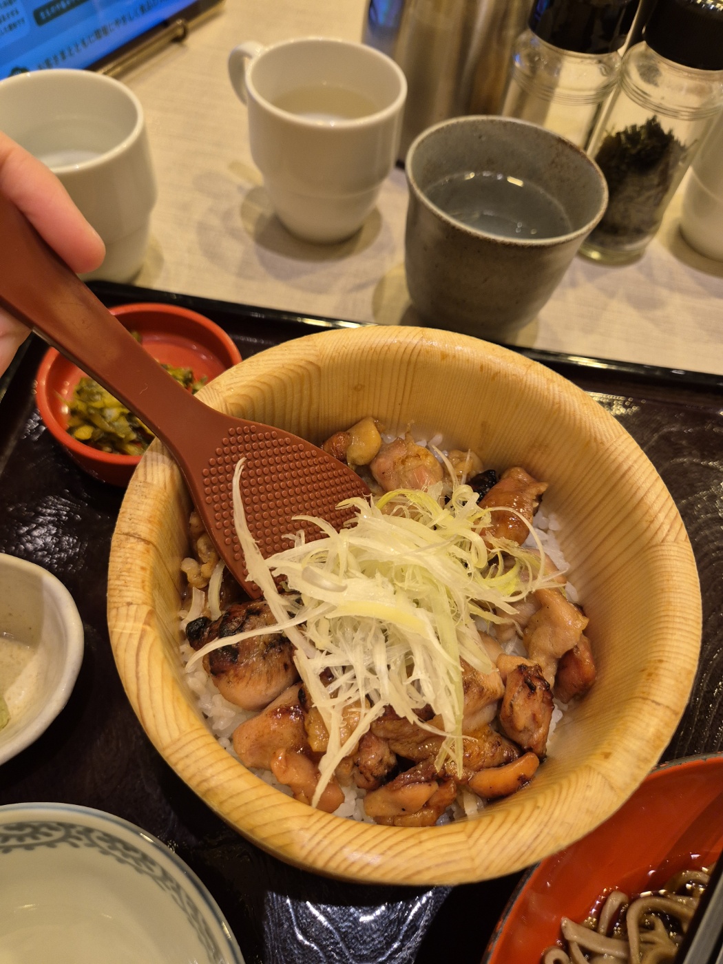 직화로 구운 닭고기와 따뜻한 밥, 그리고 소바나 우동 중 하나를 곁들여 먹을 수 있는 세트 구성이에요.
