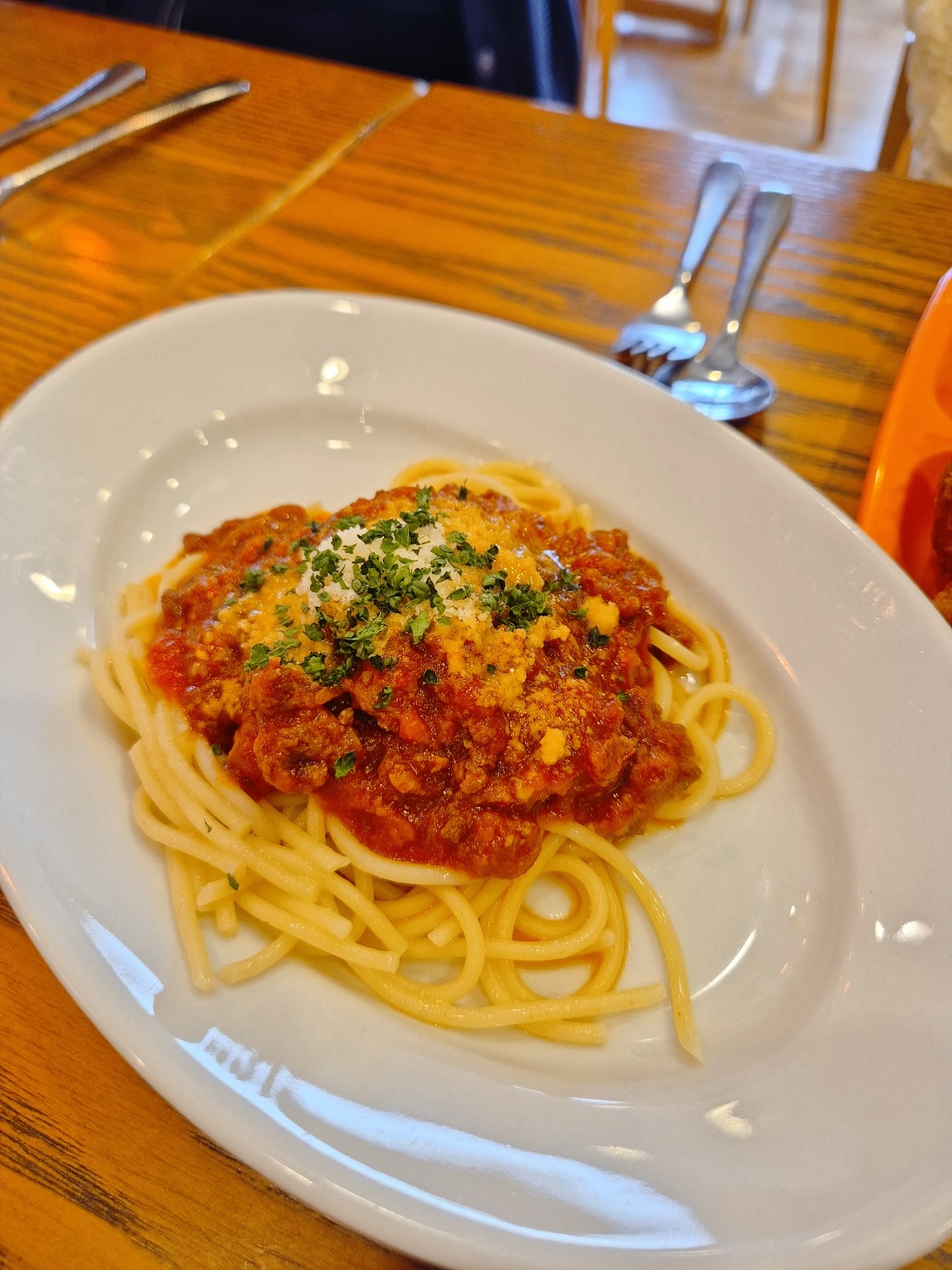 왼쪽엔 아이용 미트소스 파스타와, 오른쪽은 저희가 주문한 파스타, 피자 입니다.