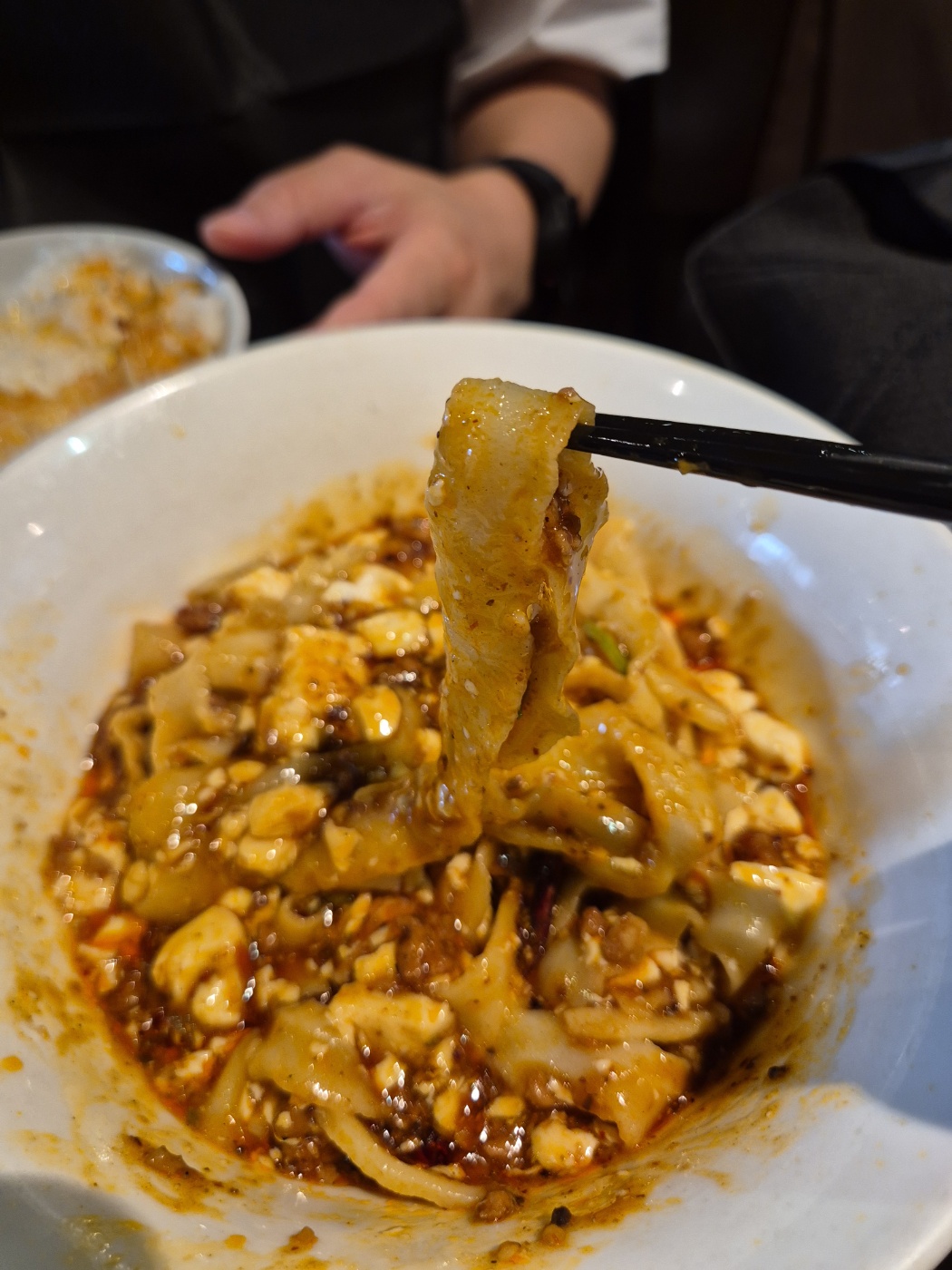 뜨거운 돌냄비에 담긴 마파두부! 25가지 이상의 향신료가 조화를 이루며, 단순히 매운 게 아니라 깊은 감칠맛이 납니다.한국인에게 익숙한 돌솥비빔밥 대신 돌솥마파두부 느낌이에요. - 麻辣刀削麺 ( 마라 토쇼우멘 )